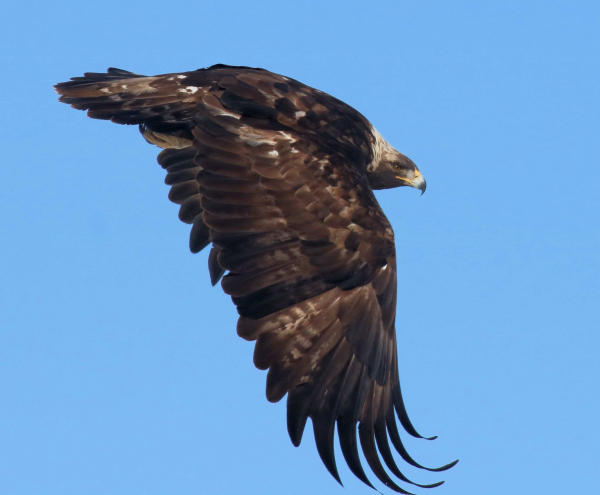 During a birding trip you brake at the sight of a superbird; you ease into position with the sun at your back, and with a little luck you spend some time photographing the feathered prize – say a Golden Eagle perched on a hefty branch. During a tense moment when the bird may flee or stay, the big adult seems to relax, preens a bit, then something catches its attention. The Golden moves its head intently from side to side, seemingly zeroing in on a movement in the distance.