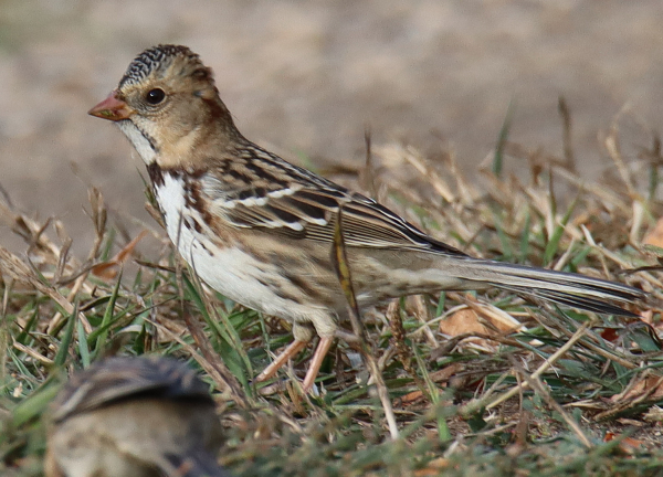 Harris’s Sparrows are special to the Central Flyway, and they stand out with their larger size, distinctive black and white plumage on their neck and breast, their longer tail, and pinkish beak.