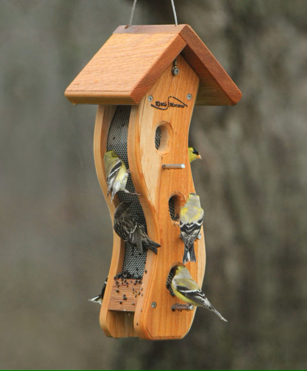 We are always looking for a new twist on feeders, so the appearance of the Kettle Moraine Small Wave Finch Feeder definitely caught our eye. Just the right size for a variety of finches, including goldfinches (7x6 inches x 16 inches tall), the Small Wave Feeder is made of solid cedar and constructed with stainless steel screws. This attractive finch feeder will last for years. Aluminum perches at screened feeding ports serve up to 6 finches at a time, and the stainless steel mesh sides provide additional feeding areas that add up to 4-sided finch feeding opportunities.