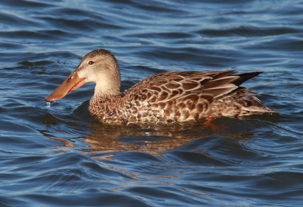 A close-up of a female Northern Shoveler is emblematic as 1 of more than 600 encountered in a feeding concentration at Long Lake Refuge.