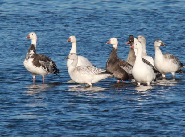 A variety of plumage types of Snow Geese are represented in this small group, including a hybrid white and blue morph Snow at left, adult and young white morph Snows, plus a blue morph adult and juvenile.