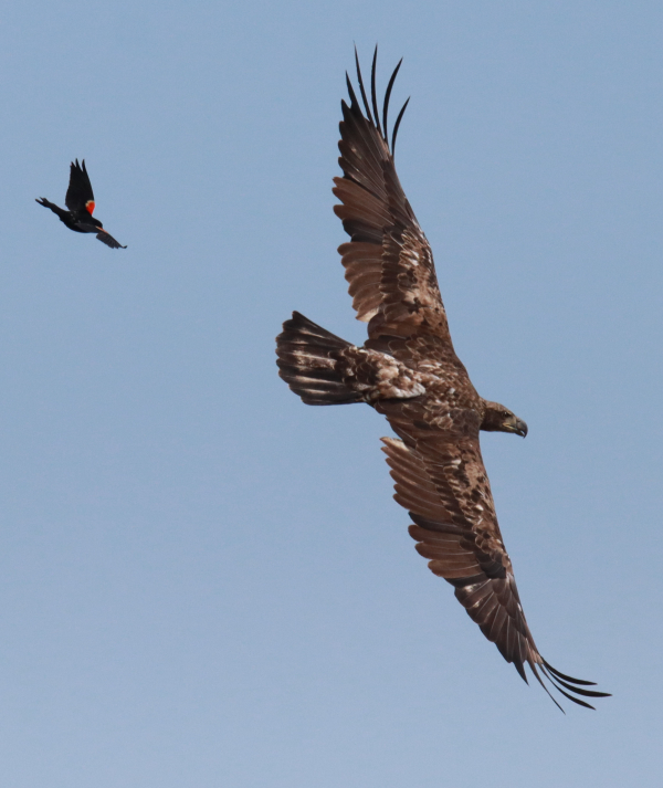 During the past week it seemed most birds of prey were being harried by blackbirds or kingbirds, such as this yearling Bald Eagle being chased by a very territorial Red-winged Blackbird.