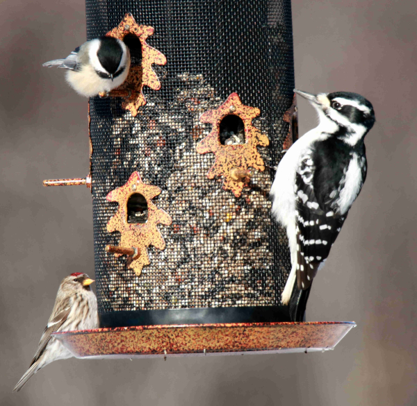 A variety of seed-eating birds will visit any feeder stocked with shelled sunflower seeds, such as this Hairy Woodpecker, Redpoll, and Black-capped Chickadee (photos by Paul Konrad).