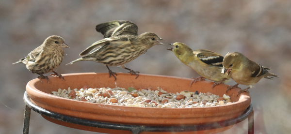 As finch season approaches, small birds such as these Pine Siskins and American Goldfinches will prefer shelled sunflower seeds over other foods.