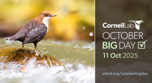 A White-throated Dipper photo by Iker Martinez promotes this year's October Big Day festivities coming up Saturday October 11th.