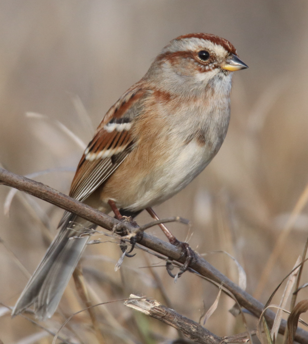 Can you identify this native sparrow’s species? It’s an American Tree Sparrow, a species often encountered in small flocks during Project FeederWatch observations (photo by Paul Konrad).