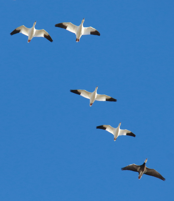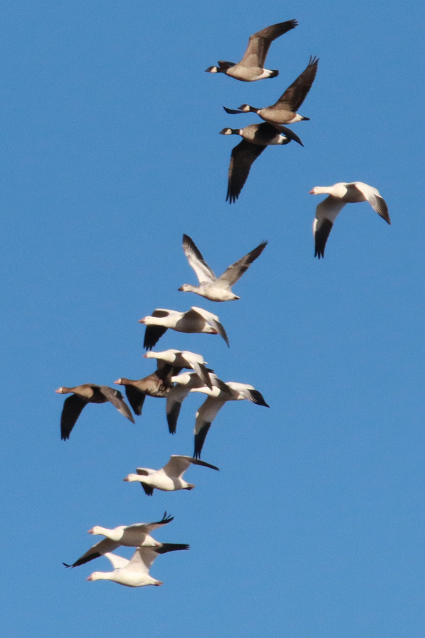 The 4 species of Arctic-nesting geese that migrate through the area can be seen in this photo. Starting from the top, Cackling Geese, Snow Geese, and White-fronted Geese are easily recognizable, and the lone Ross’s Goose is flying to the right of the White-fronts in this photo.