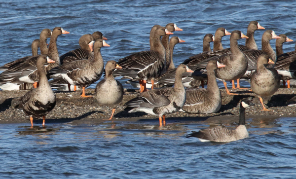 A lone Cackling Goose was swimming next to a regular resting location for White-fronted Geese.