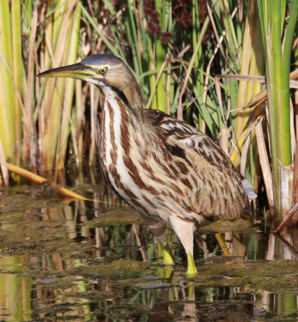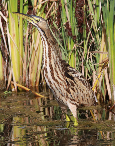 A pair of photos show an American Bittern hunting on the edge of cattails, then extending its neck upward, probably in reaction to eventually seeing the photographer and thereby providing 2 different views of the wading bird.