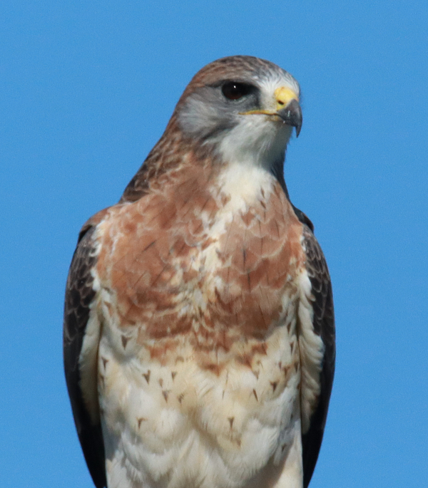 Representing the last opportunity to photograph a Swainson’s Hawk before the species as a whole migrated south, this impressive raptor shows a unique extension of a line of white feathers that continues down its breast from its white throat plumage. Usually the breast feathers are a rather uniform chestnut-brown.