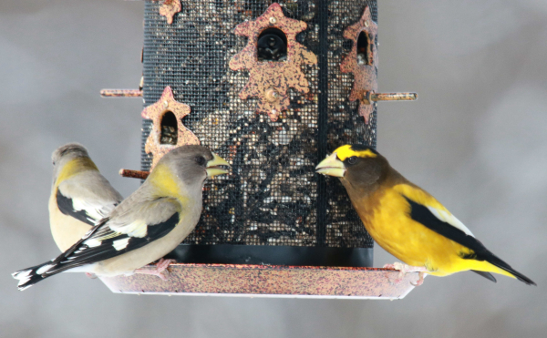 Grosbeaks are another of the specialized finches that may visit northern feeding stations this winter, such as these female and male Evening Grosbeaks.