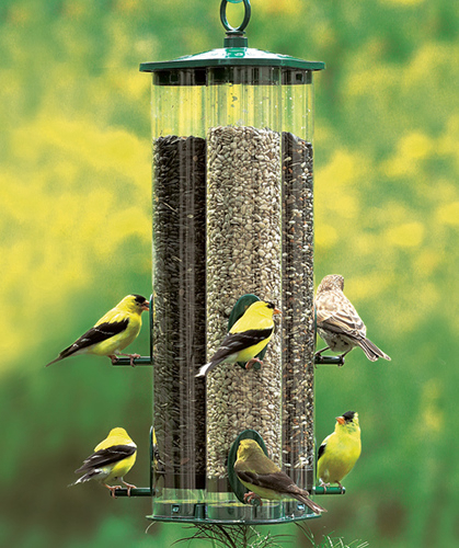You can combine 3 separate kinds of seeds with the Triple Tube Feeder, available exclusively from Duncraft and on sale now. Measuring 17½ inches tall, it has 6 feeding stations and holds up to 4 pounds of seeds. This Duncraft feeder has a durable metal cap, base, and seed ports, and the tubes are made of recycled resin, which is more durable than ordinary plastic. Built for durability with a chew-proof metal top and bottom, the clear tubes permit you to easily view seed levels. Just remove the cap for easy filling from the top.