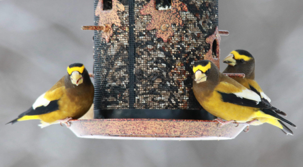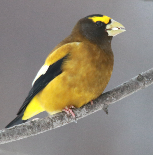 Regardless of how close your feeders are located to your viewing position, a binocular view will reward you with closer looks when a new species arrives (Evening Grosbeak photos by Paul Konrad).