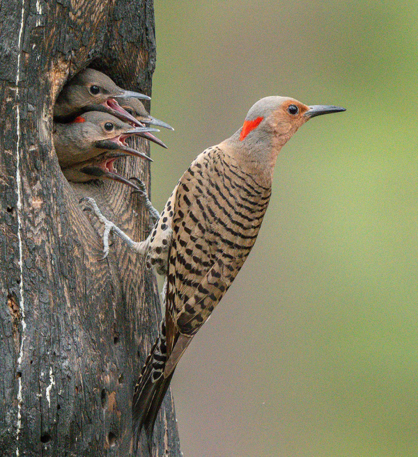 A candid photograph of a Northern Flicker during a visit to its nesting cavity filled with fledglings that are ready to fledge is an example of the variety of photographs that illustrate Woodpecker (photo by Paul Bannick).