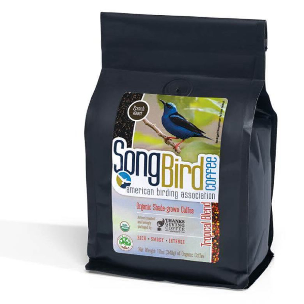 As an example of the ABA’s five rich Songbird Coffees, the Tropical Blend French Roast Coffee is described as a full-bodied smoky flavorful French roast coffee is a blend of beans from three different certified bird-friendly coffee cooperatives in Colombia, Nicaragua, and Guatemala.