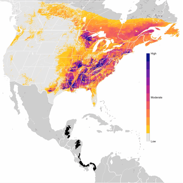 In the past, joint conservation efforts across borders have been limited by a lack of understanding of how birds connect habitats and people across seasons. To guide international collaboration, the study applied a framework developed by Partners in Flight and the Cornell Lab to trace “stewardship connections,” regions of North America where species that depend on the 5 Great Forests concentrate to nest.
